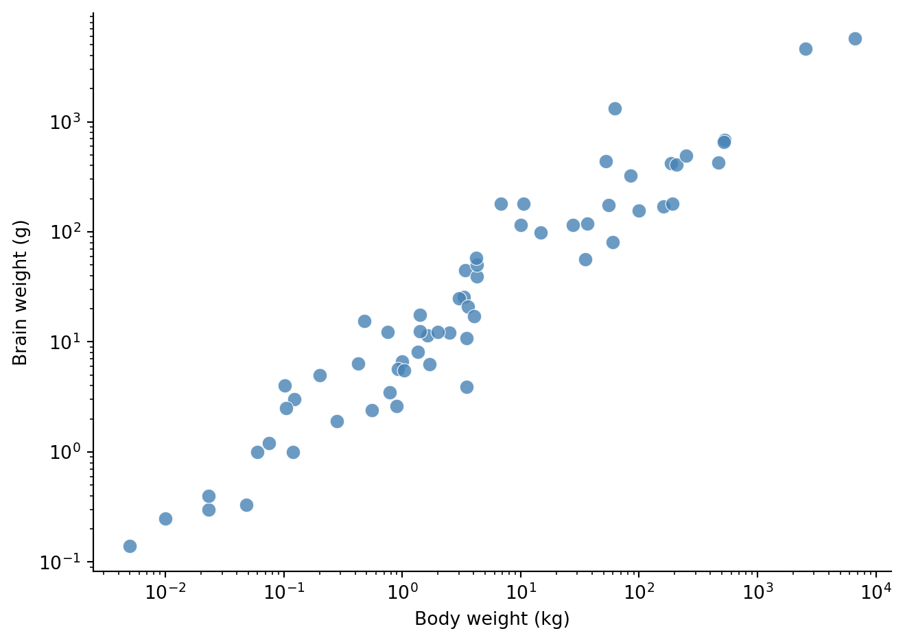 print("Correlation: ", "\n", bb_weights[["body_weight", "brain_weight"]].corr())Summary statistics:
