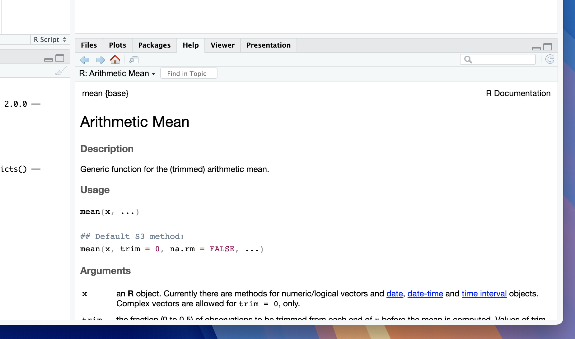 ?mean()If you run this code you will see the documentation for the mean() function displayed in the Help tab.