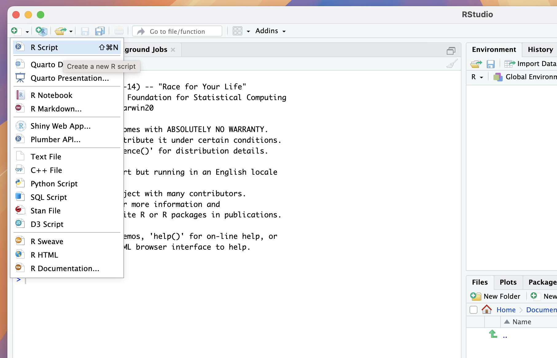 Create and save your first R script (choose whatever name you like) to your working directory.