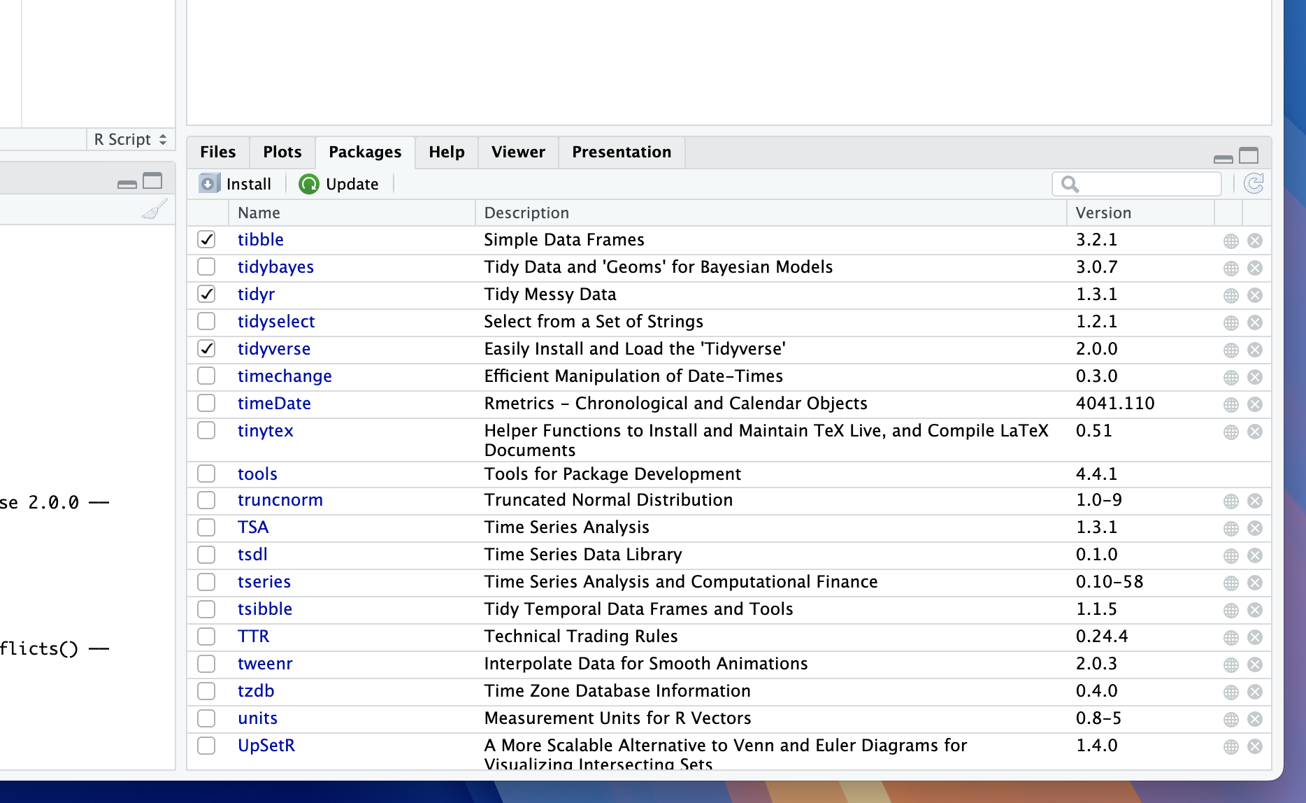library(tidyverse)Your console output will often provide relevant information about the version of the package and its compatibility with your downloaded version of R and other loaded packages. Running this function will check the box next to tidyverse in the package tab.