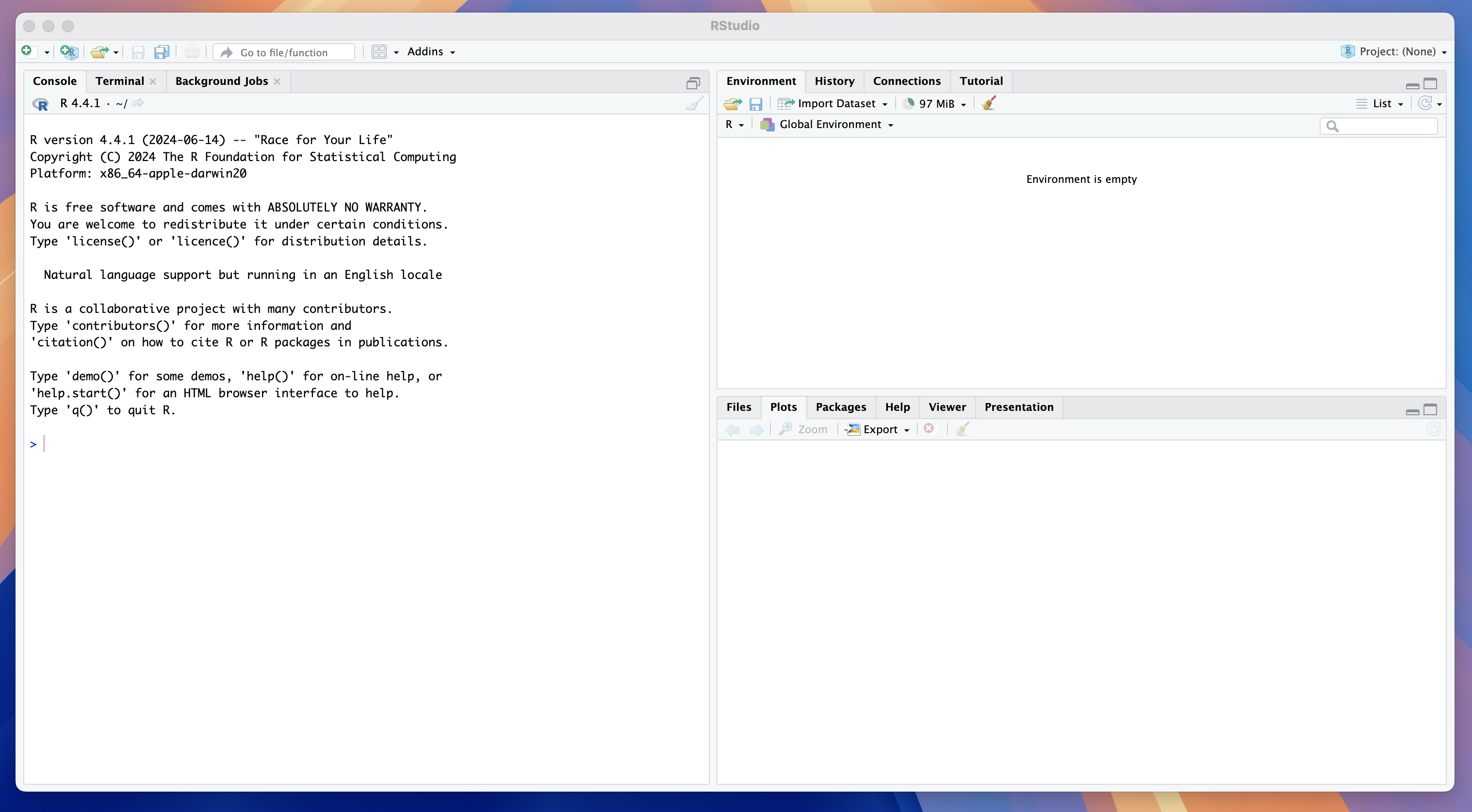 When you first open RStudio the application will be split into several sections called panes, each with a selection of tabs.