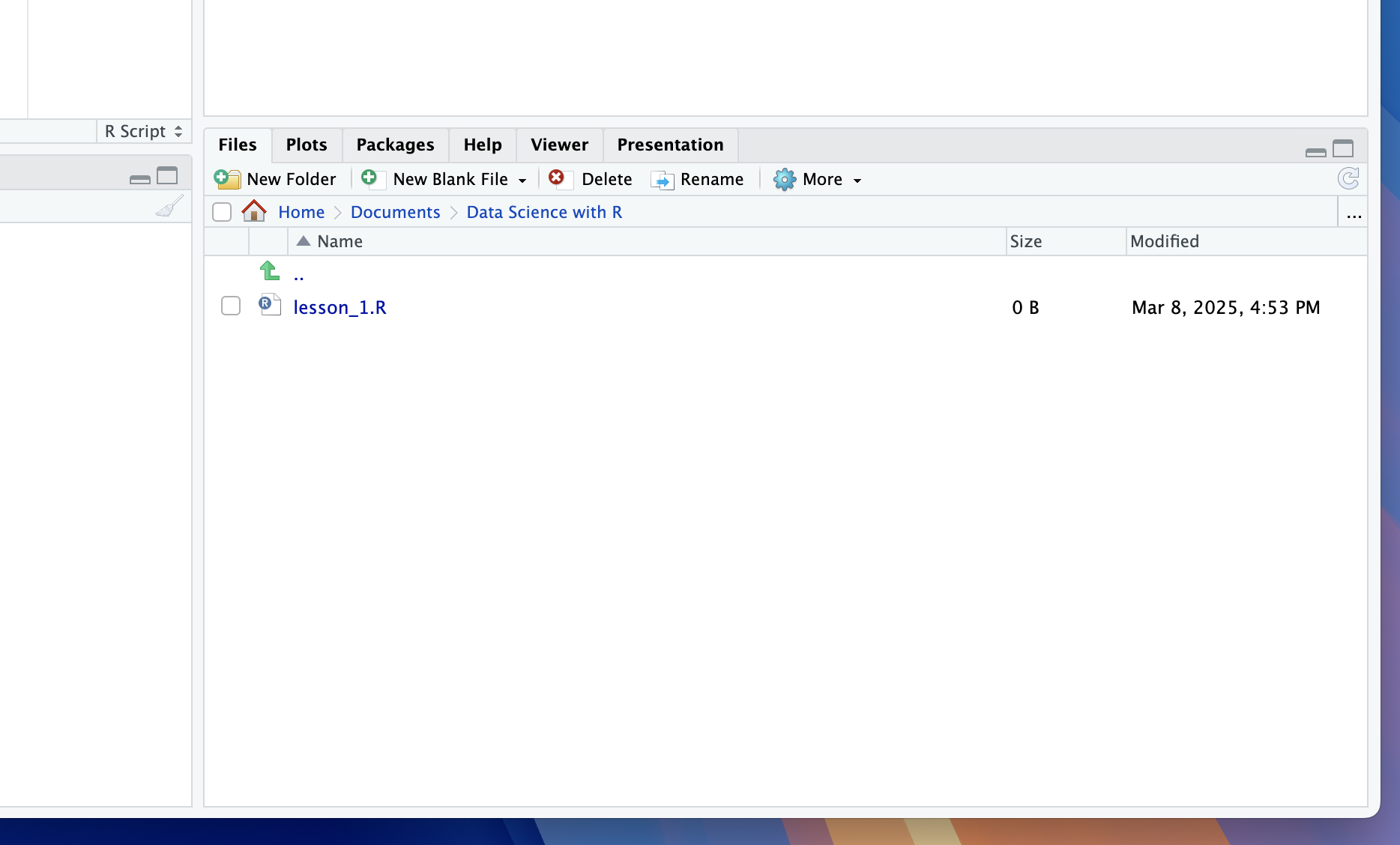 Lets prepare to create our first R script. First navigate to your desired course folder (or create on) and set it as your working directory.