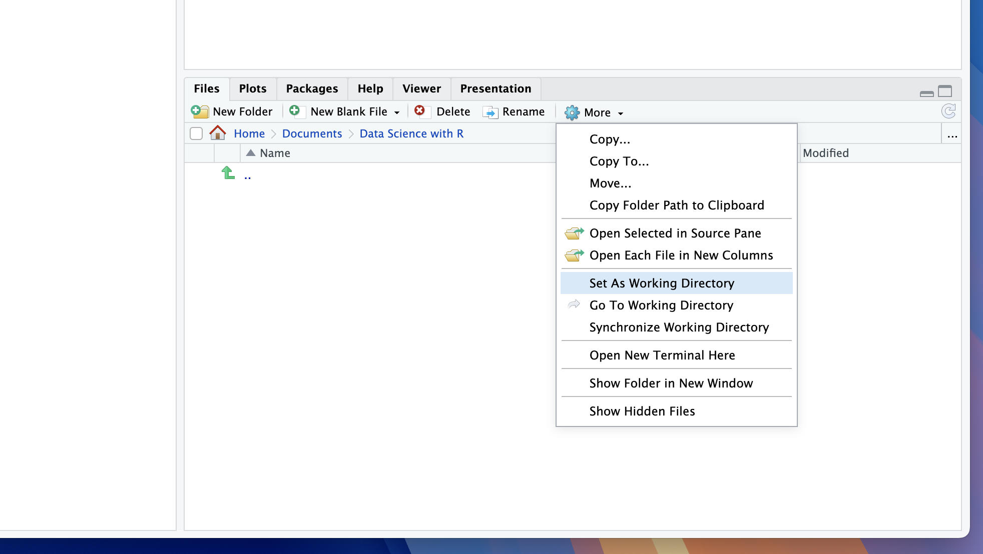 Navigating to the desired folder in the files tab, clicking on the more settings cog and selecting Set as Working Directory.